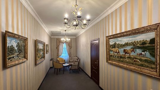 Парадная деревянная лестница, картины-гобелены в коридорах и изразцовая печь в обеденном зале переносят вас в эпоху начала XX века